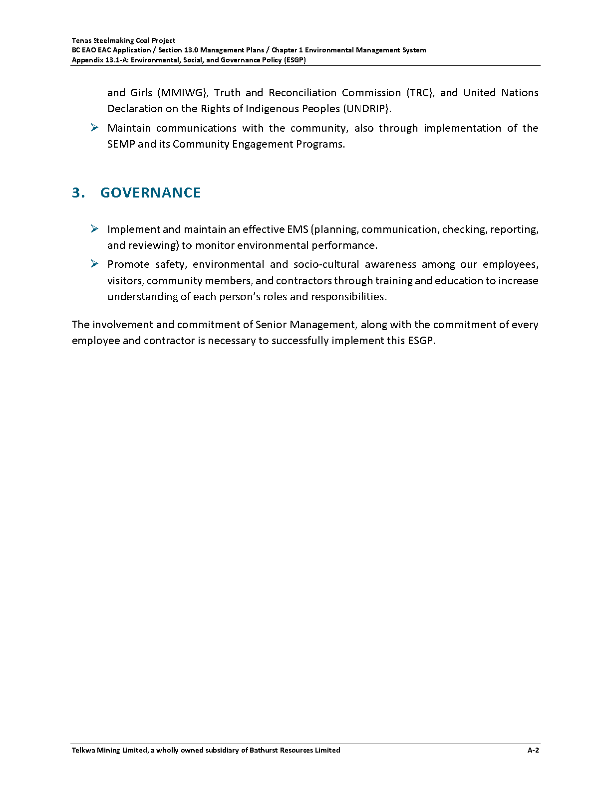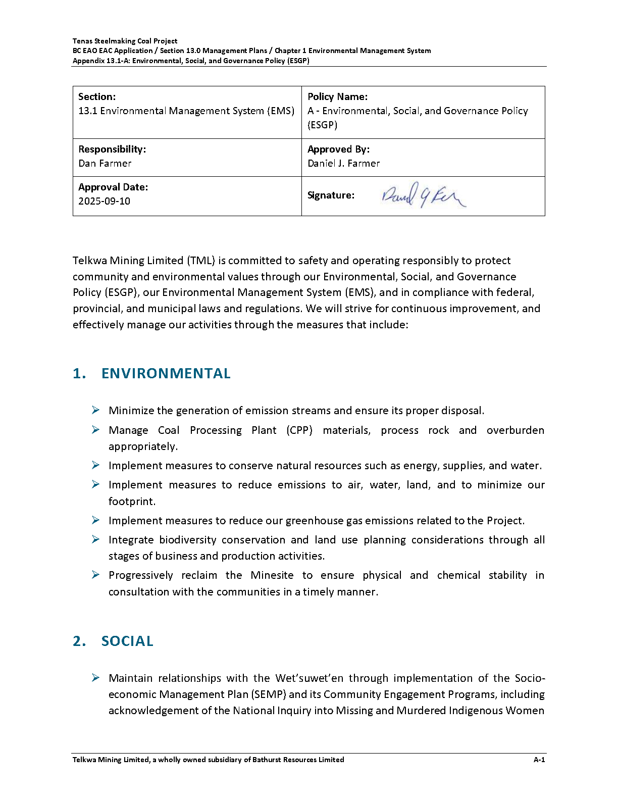 Below is Telkwa's ESGP referenced in Section 13.1 Environmental Management System (EMS) of the Environmental Assessment Application that may also be downloaded here: