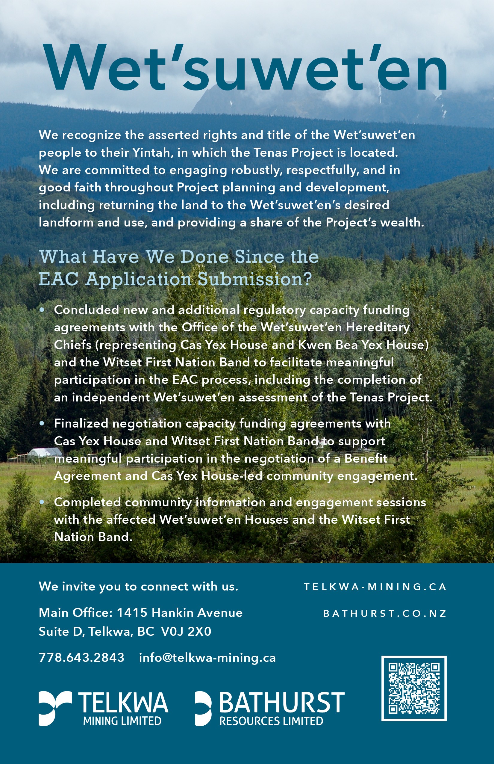 Telkwa Mining recognizes the unceded rights and title of the Wet’suwet’en to their traditional territory, within which the Tenas Project is proposed.